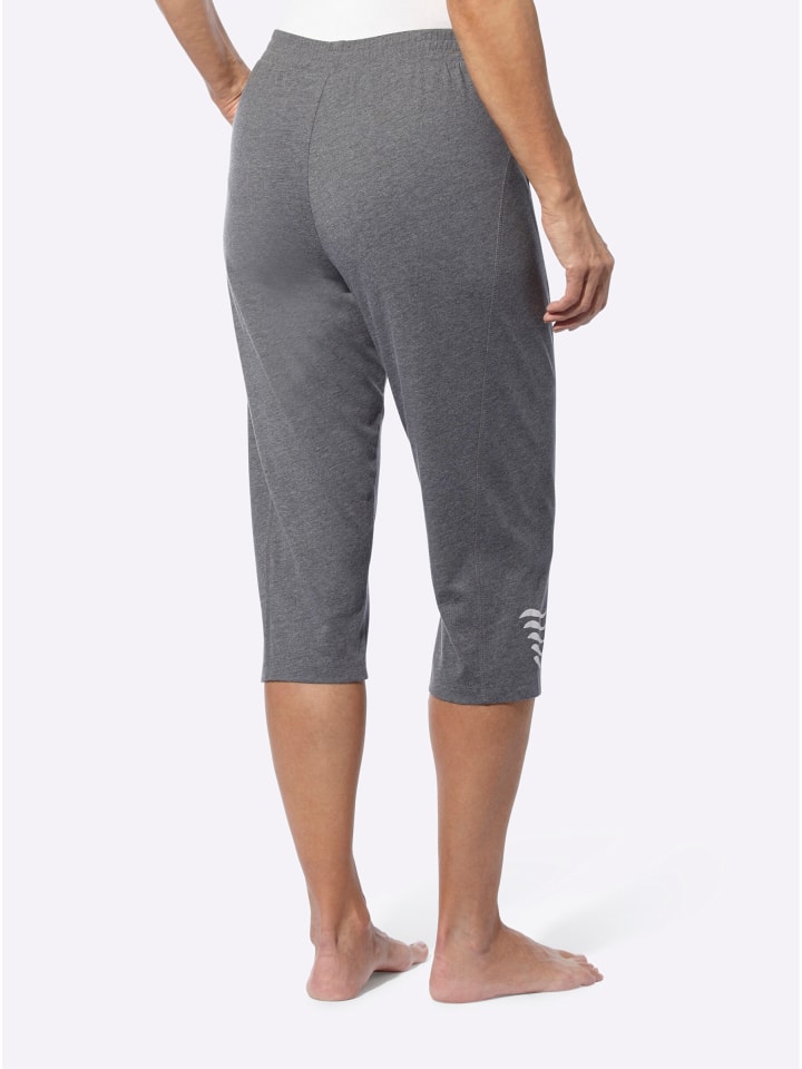 Продуманная отделка швов придает этим капри для отдыха облегающий вид: боковые швы закруглены спереди и сзади, визуально подчеркивая фигуру! Мерцающий принт на брючинах. Удобный эластичный пояс, 2 кармана.