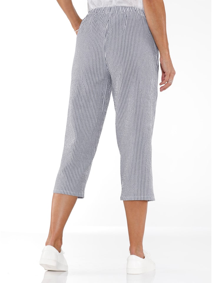 Тонкие полоски на жатом сирсакере - вот как выглядят эти воздушные капри. Удобный эластичный пояс с гладкой передней частью создает идеальную посадку. Стильные разрезы для стопы. Ширина стопы около 43 см.