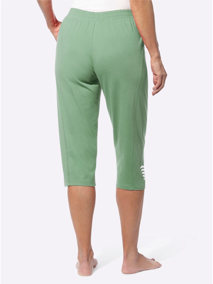 Продуманная отделка швов придает этим капри для отдыха облегающий вид: боковые швы закруглены спереди и сзади, визуально подчеркивая фигуру! Мерцающий принт на брючинах. Удобный эластичный пояс, 2 кармана.