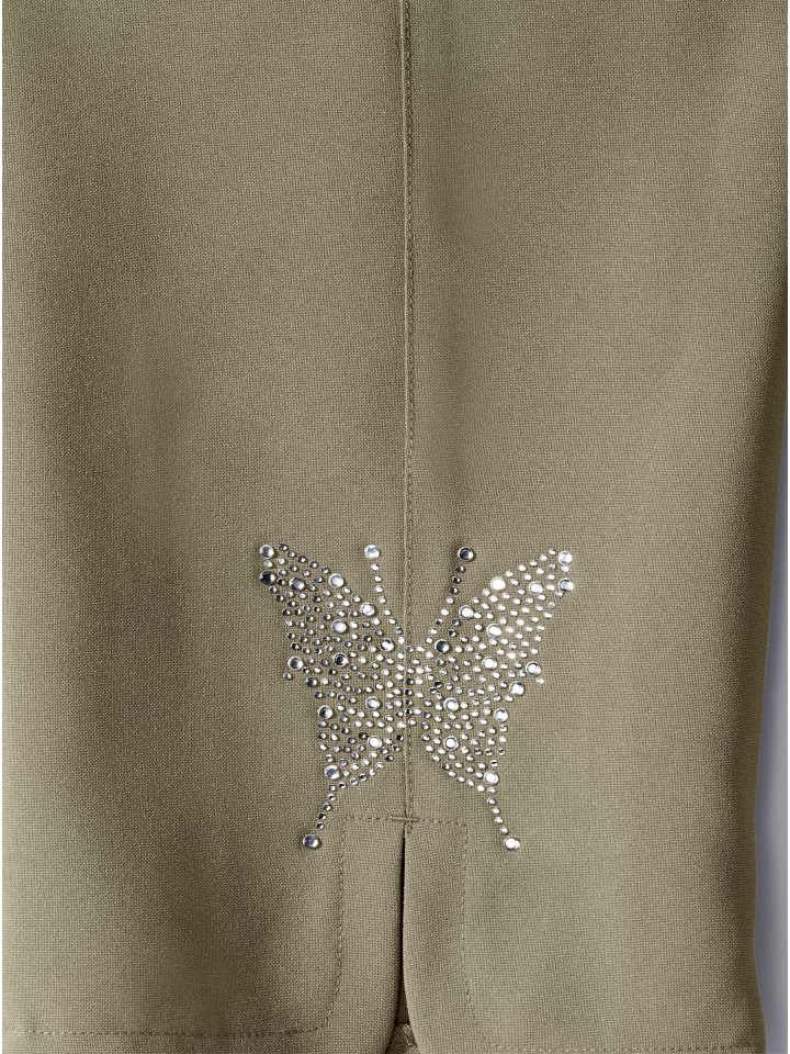 Эти брюки должны быть в каждом летнем гардеробе! Капри с двумя закругленными передними карманами и разрезами для ног. Сверкающая аппликация в виде бабочек на штанине.