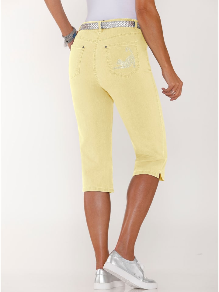 Незаменимая вещь для лета! Джинсы-капри с эластичным поясом сбоку, шлевками для ремня и застежкой на пуговицу и молнию. Два передних кармана. Один из двух задних карманов украшен изображением кота, выполненным из эффектных стразов. Ширина до щиколотки: около 38 см. - Модная аппликация из стразов. - Идеальная посадка. - Модная длина капри. - Удобный эластичный пояс сбоку. Состав: - 97% хлопок, 3% эластан.