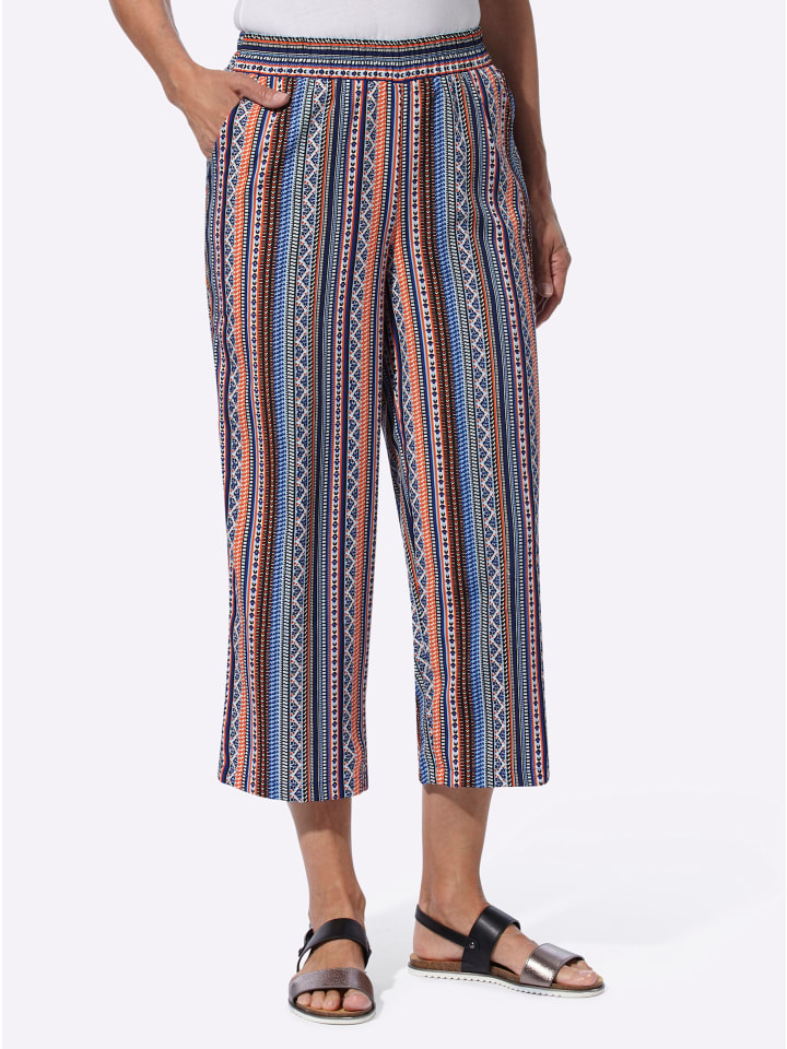 Эти брюки - два стильных компаньона в одном! Одни однотонные, а другие с этническими полосками. Удобный пояс на резинке по всему периметру и модный свободный крой. Два практичных кармана.