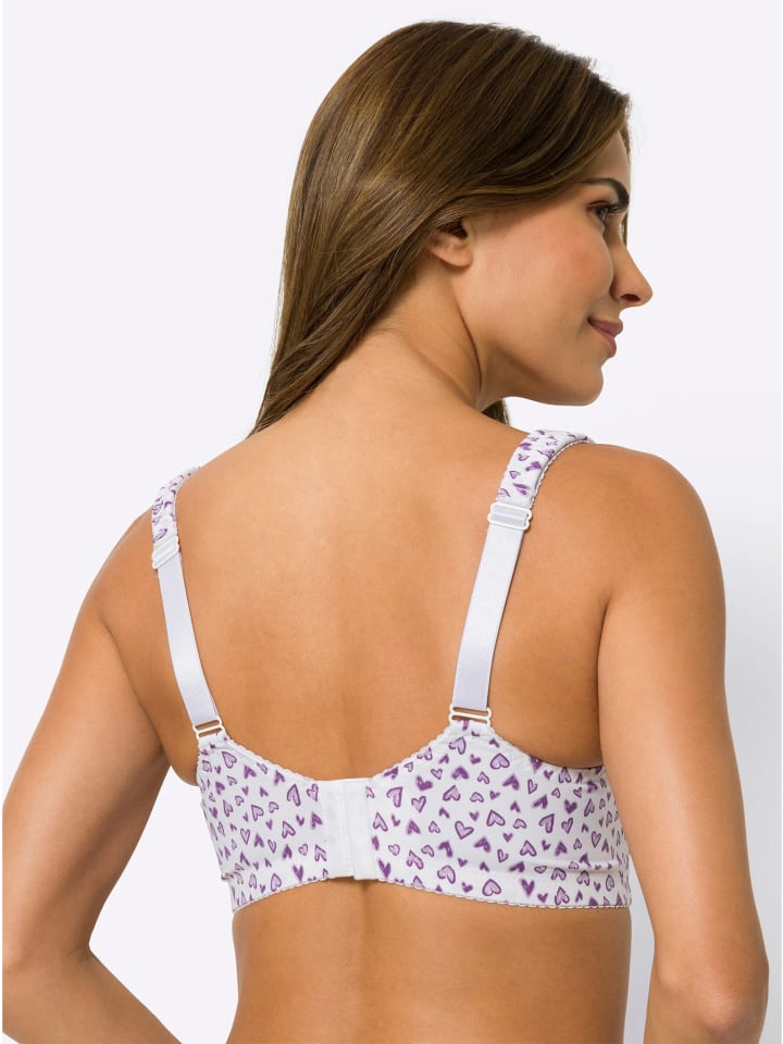 Мягкий, но прочный: этот бюстгальтер на косточках обеспечивает высокий комфорт и оптимальную поддержку. Доступен в однотонном варианте или с рисунком в виде сердечек по всей поверхности. Чашечки из трех частей с кружевной отделкой и небольшим атласным бантиком. Широкие, удобные и мягкие бретели с подушечками, регулируемые сзади.