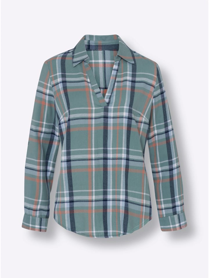 Приятная мягкость, теплота и спортивный клетчатый рисунок - вот что представляет собой эта фланелевая блузка. Удобный фасон без застежек, рубашечный воротник и открытый V-образный вырез. Вытачки на груди и кокетка на спинке с плиссировкой обеспечивают идеальную посадку. Длинные рукава с манжетами на пуговицах можно подвернуть до ¾. Низ также закругленный.