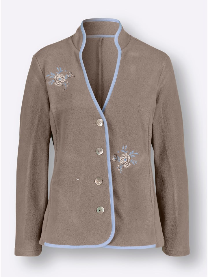 Эта чудесно теплая флисовая куртка обретает свое альпийское очарование благодаря своему крою с контрастной окантовкой и традиционной вышивкой. Она имеет воротник-стойку, открытый V-образный вырез и планку на пуговицах. Два кармана. Ажурные швы обеспечивают идеальную посадку.