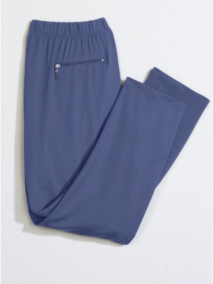 Практичные, удобные, простые в уходе! Брюки для отдыха из гладкой микрофибры. С поясом на резинке по всему периметру и одним горизонтальным карманом на молнии спереди.