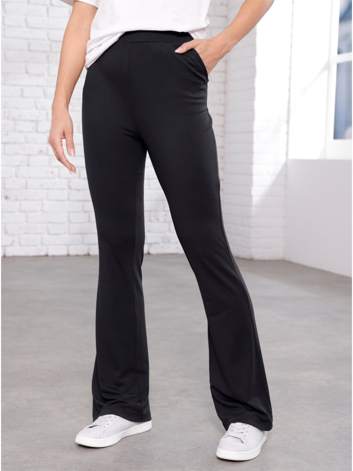 Легкие в уходе и быстросохнущие брюки для отдыха в стиле джаз-брюк: узкие в бедрах и слегка расклешенные ниже колен. Удобный пояс на резинке по всему периметру и два практичных кармана.
