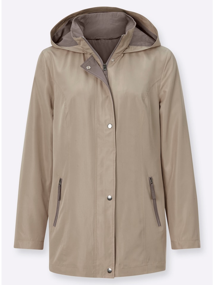 Идеально подходит для межсезонья: куртка со стильными контрастными вставками. С капюшоном, отложным воротником и застежкой-молнией, скрытой под планкой с пуговицами и серебристыми кнопками. Косые карманы на молнии с окантовкой. Вытачки для идеальной посадки. С практичным внутренним карманом.