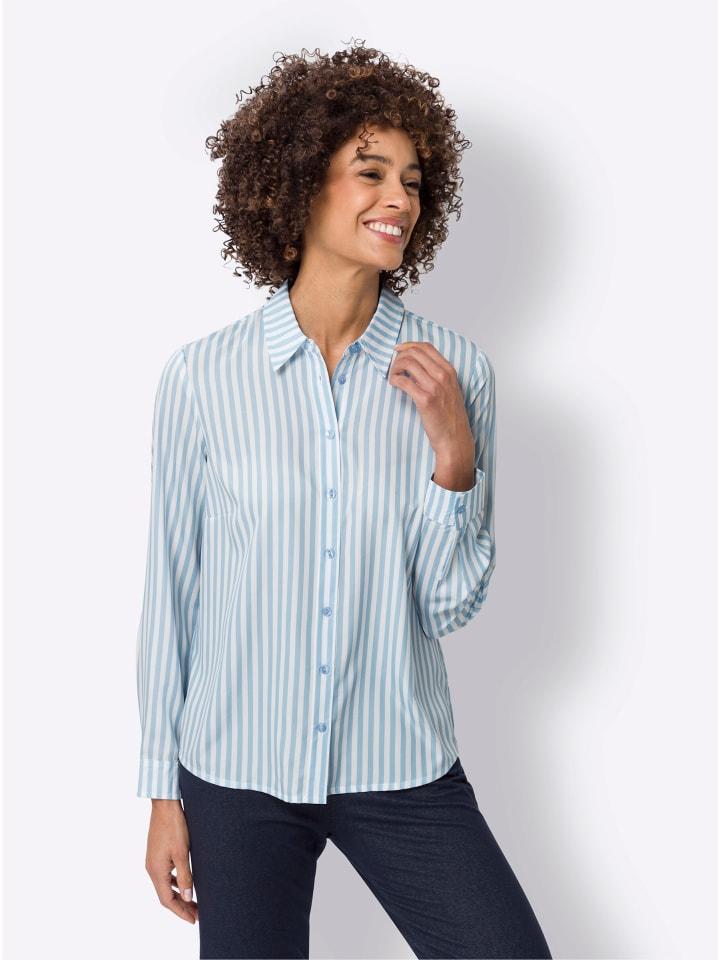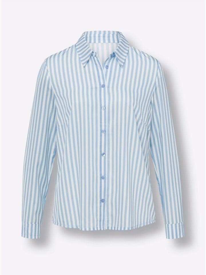 Эта простая в уходе блузка-рубашка с визуально удлиняющим вертикальным рисунком в полоску - вневременная классика, подходящая для многих случаев. Она отличается рубашечным воротником, планкой на пуговицах, корректирующими вытачками на груди и манжетами на пуговицах на концах длинных рукавов.