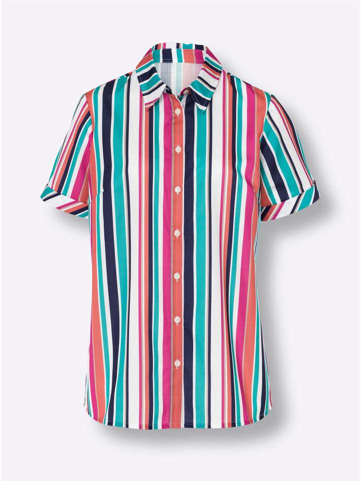 Модная покупка для любого гардероба: блузка из привлекательного льняного кроя с вертикальными полосками, подчеркивающими фигуру. Классический рубашечный воротник, длинная планка с пуговицами и короткие рукава с имитацией отворота. Вытачки, корректирующие форму груди.