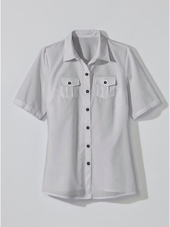 Блузка из приятной, легкой ткани. Классическая, с рубашечным воротником, застежкой на пуговицы по всей длине и двумя накладными нагрудными карманами с клапанами.