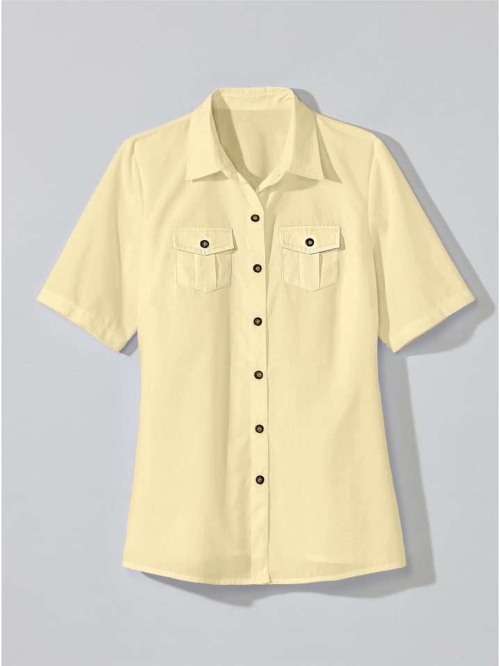 Блузка из приятной, легкой ткани. Классическая, с рубашечным воротником, застежкой на пуговицы по всей длине и двумя накладными нагрудными карманами с клапанами.