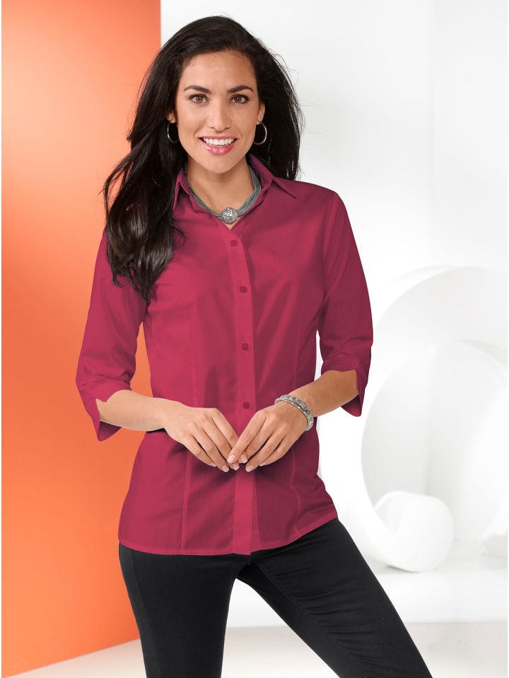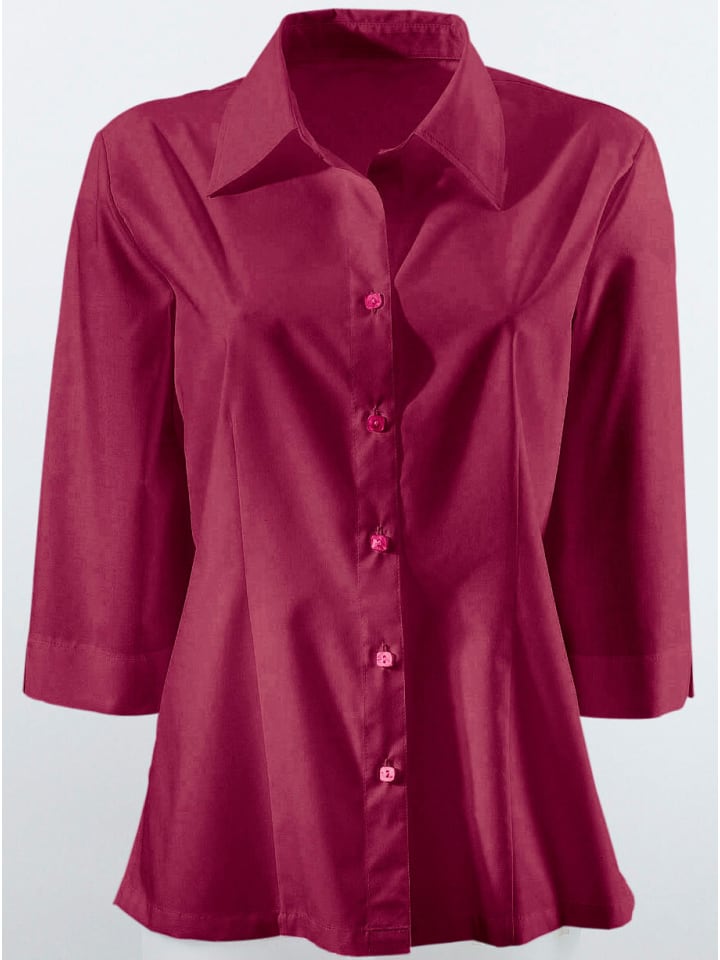 Классическая блузка с 3-4 рукавами, квадратными пуговицами и разрезами по бокам.