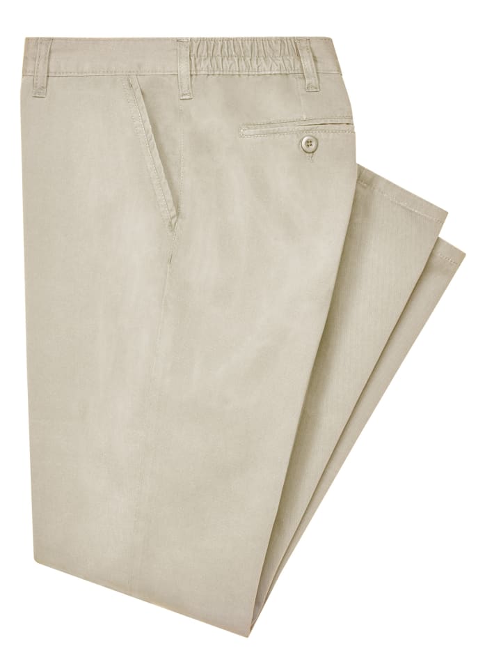 Комфорт без компромиссов: невероятно удобные брюки с эластичными боковыми вставками на поясе. 2 передних кармана и 2 задних кармана с окантовкой на пуговицах. Шлевки для ремня. Удобные и дышащие. Без ремня.
