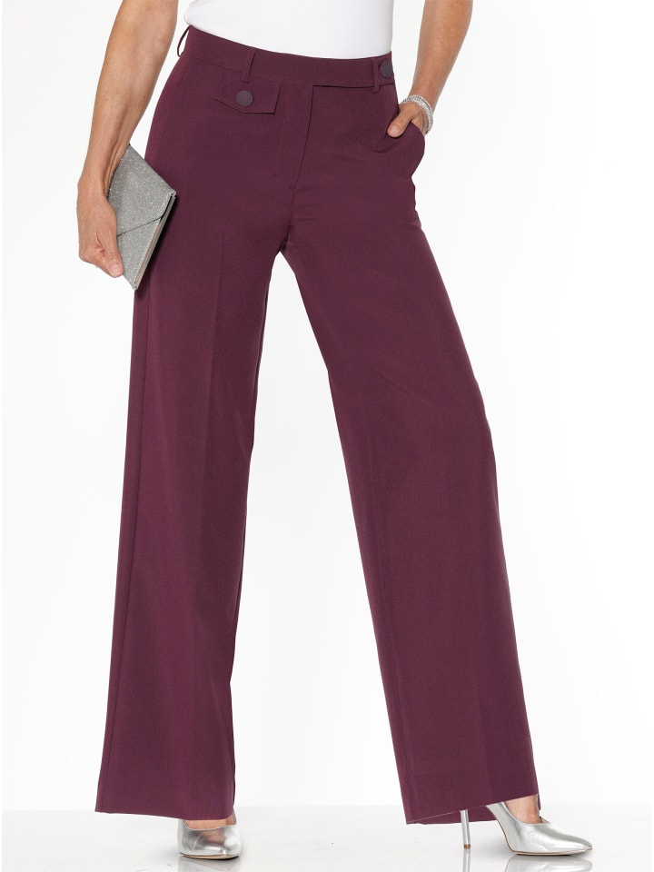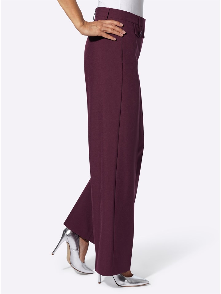 Изысканный внешний вид и простота ухода! Брюки с облегающими защипами и модно широкими брючинами. Шлевки для ремня, застежка на пуговицы сбоку и молния по центру. Небольшой клапан с декоративной пуговицей спереди под фигурным поясом. Изготовлены из переработанного полиэстера. Ширина до щиколотки: примерно 58 см. Ремень в комплект не входит.