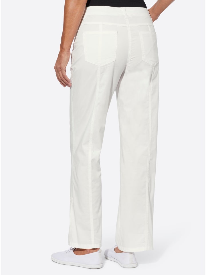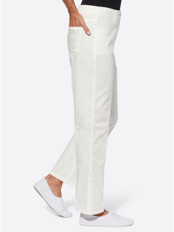 Эти брюки идеально подходят для повседневного образа. Изюминкой являются закатанные штанины с хлястиками: они в мгновение ока превращают длинные брюки в брюки длиной 7/8! Формованный пояс со шлевками для ремня и застежкой на пуговицу и молнию. Два передних кармана, один сзади с приталенной кокеткой и накладными карманами. Визуально удлиняющие разделительные швы спереди и сзади. Ширина до щиколотки примерно 44 см. Ремень в комплект не входит.