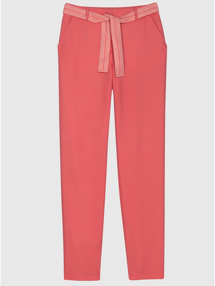 Превосходные брюки, не требующие особого ухода, с классической застежкой на пуговицы и молнию, а также завязывающимся поясом с соответствующим узором! Облегающий крой, ширина брючины около 36 см.