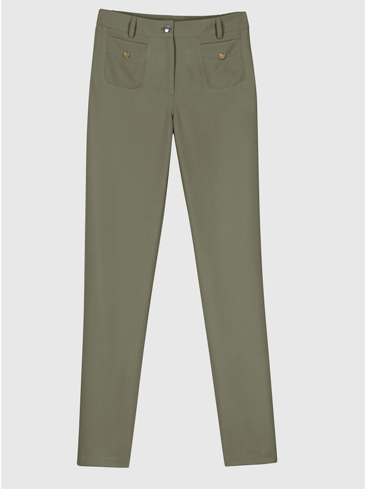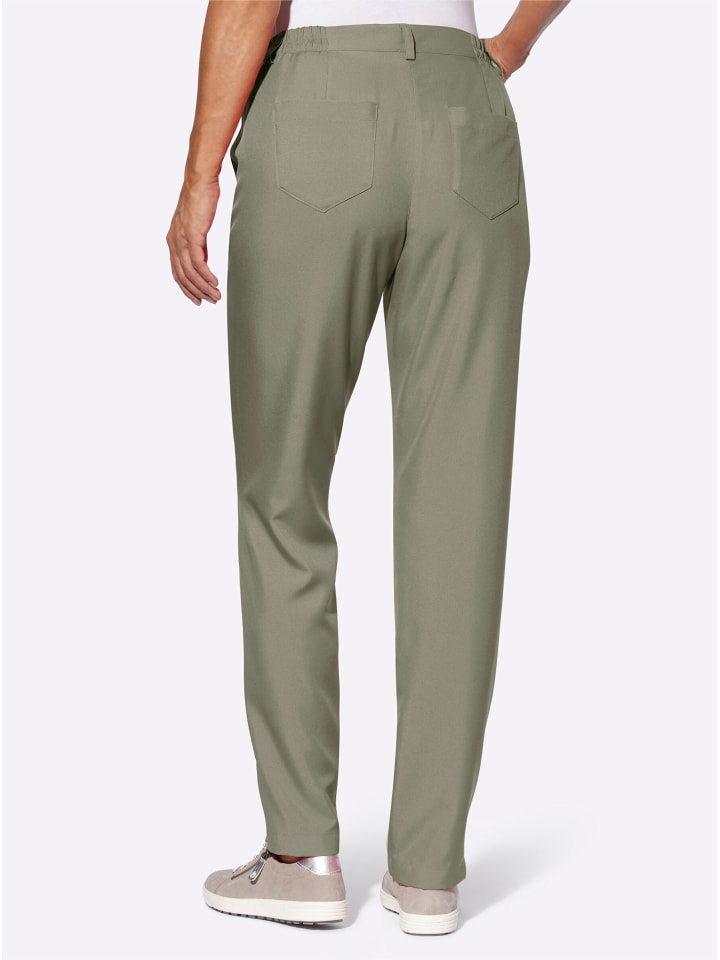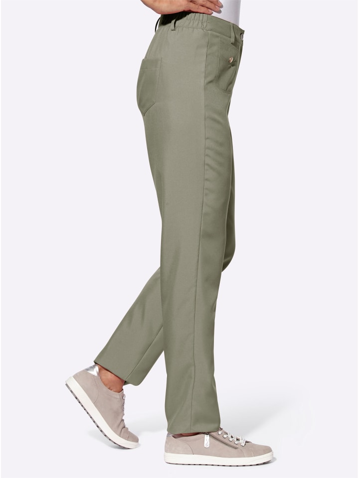 Эти брюки прямого кроя - универсальное дополнение к любому образу. Эластичный пояс сбоку обеспечивает максимальный комфорт. Спереди имеются шлевки для ремня, а также застежка на пуговицу и молнию. Два передних кармана с золотистыми кнопками и два задних кармана. Ширина по щиколотке: около 36 см. Ремень в комплект не входит.