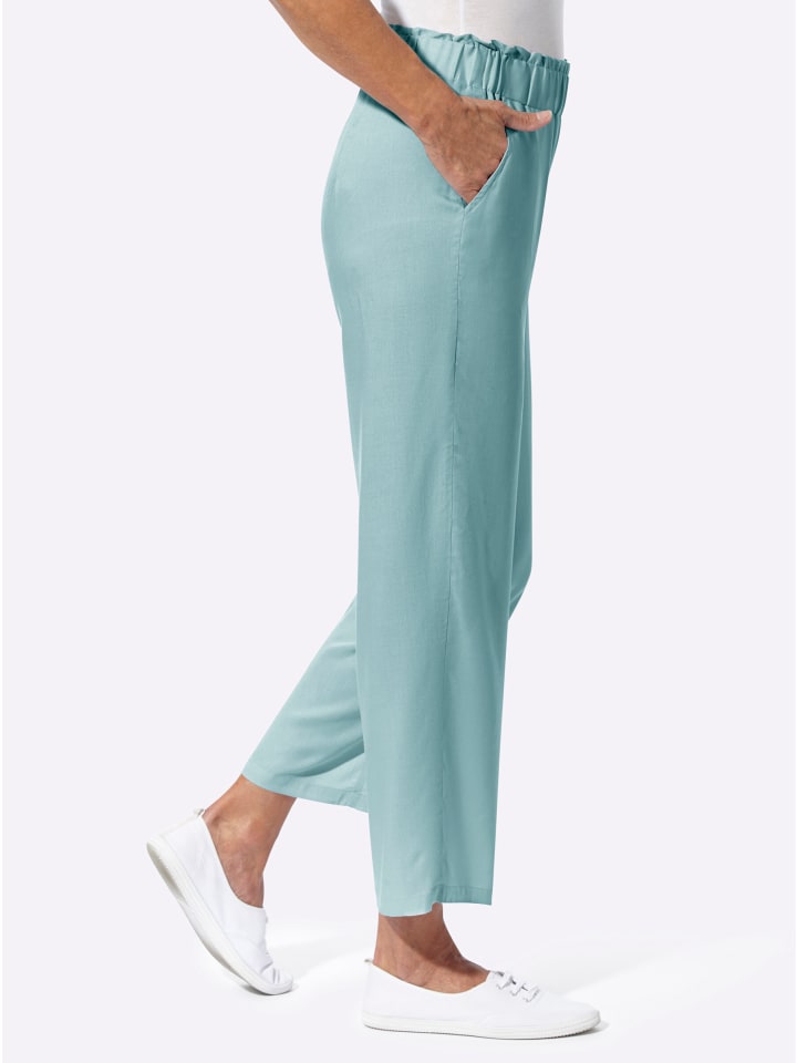 Очень широкий крой с широким, слегка гофрированным поясом на резинке придает этим брюкам длиной 7/8 модный вид. Смещенный вперед боковой шов визуально стройнит силуэт, а сзади имеются формирующие вытачки. С боковыми карманами. Изготовлены из струящейся вискозы качества ECOVERO от Lenzing. Ширина до щиколотки: около 48 см.