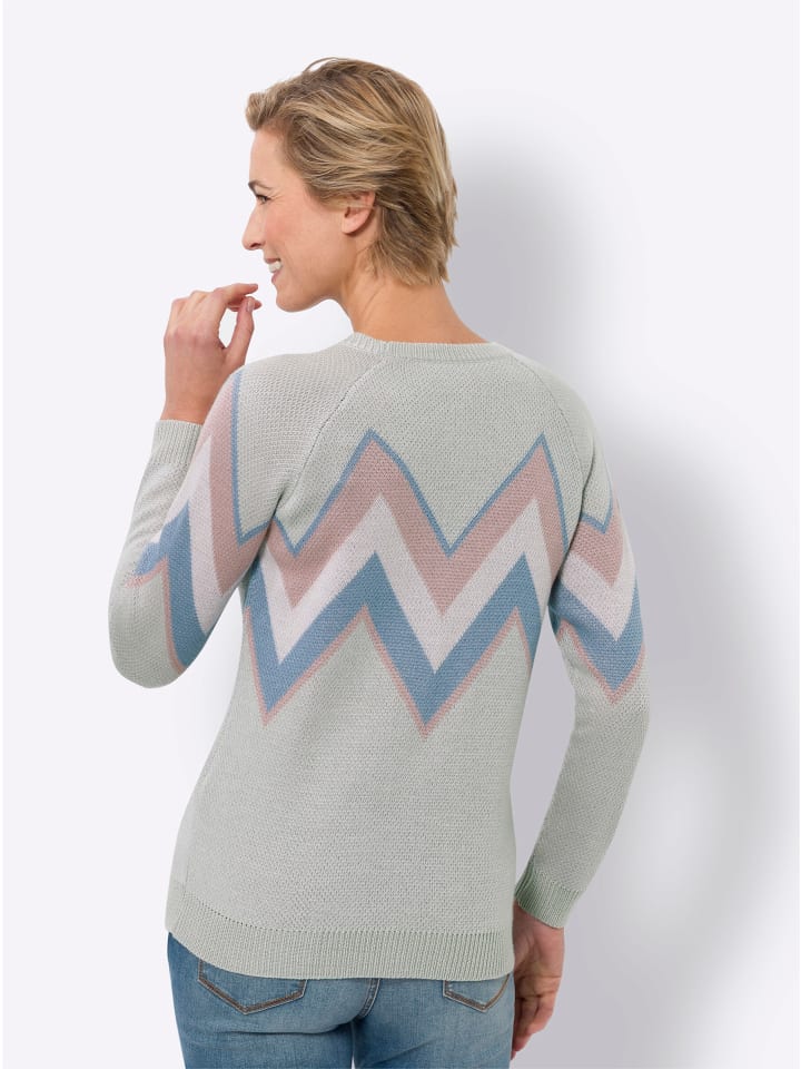 Разноцветный жаккардовый узор зигзаг делает этот свитер с длинными рукавами по-настоящему привлекательным! Удобные рукава реглан и манжеты в рубчик.