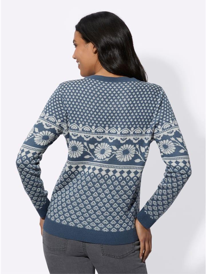 Модный экземпляр! Джемпер с круглым вырезом и красивым жаккардовым узором по всей поверхности. Ребристые манжеты на горловине, длинные рукава и подол выполнены в контрастном однотонном цвете.