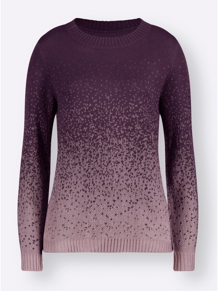 Градиент цвета делает этот свитер привлекательным и привлекательным. Круглый вырез горловины, резинка на манжетах по низу и длинные рукава.