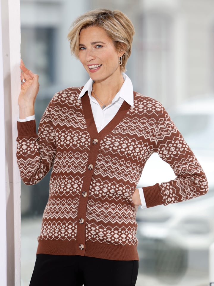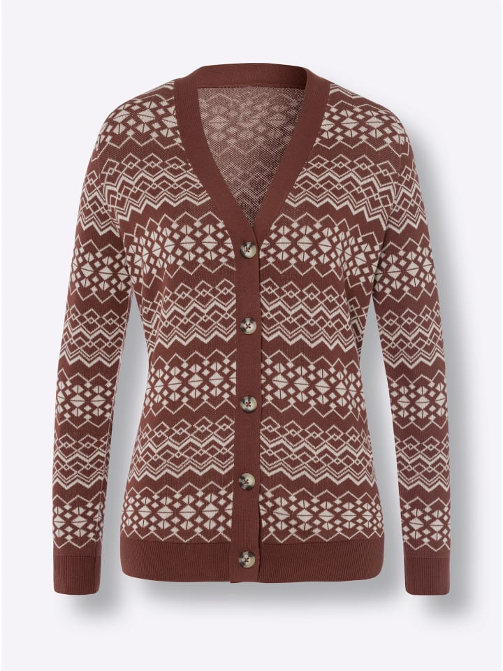 Мягкий кардиган с привлекательным жаккардовым узором. V-образный вырез и планка с пуговицами с роговым эффектом. Ребристые манжеты на длинных рукавах и по низу.