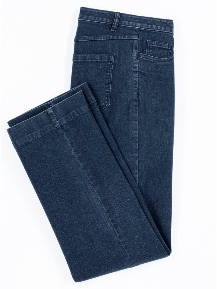 В этих джинсах вы всегда будете выглядеть безупречно благодаря эластичности и фигурному поясу! Проверенная модель с пятью карманами и модным широким кроем. Застежка на пуговицу и молнию, а также шлевки для ремня. Ширина до щиколотки примерно 50 см. Без ремня.