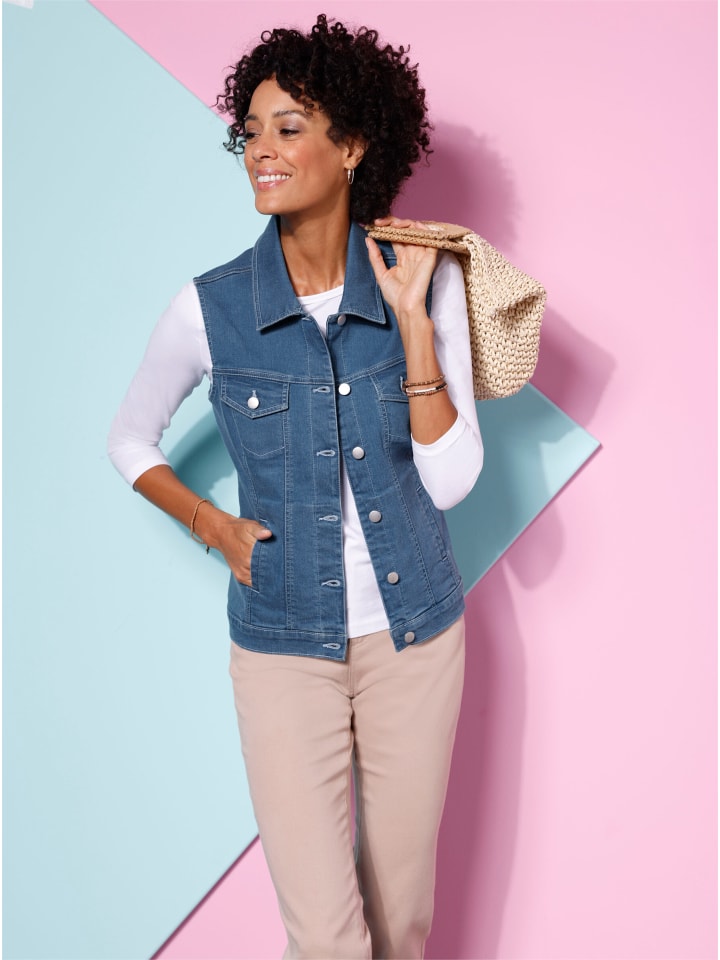 Хотите повседневный образ? С удовольствием! Этот джинсовый жилет из мягкого денима - именно то, что вам нужно. Отложной воротник и длинная планка с металлическими пуговицами. Два накладных кармана с клапанами на пуговицах и два боковых кармана. Слегка приталенный, с кокеткой и моделирующими швами спереди и сзади.
