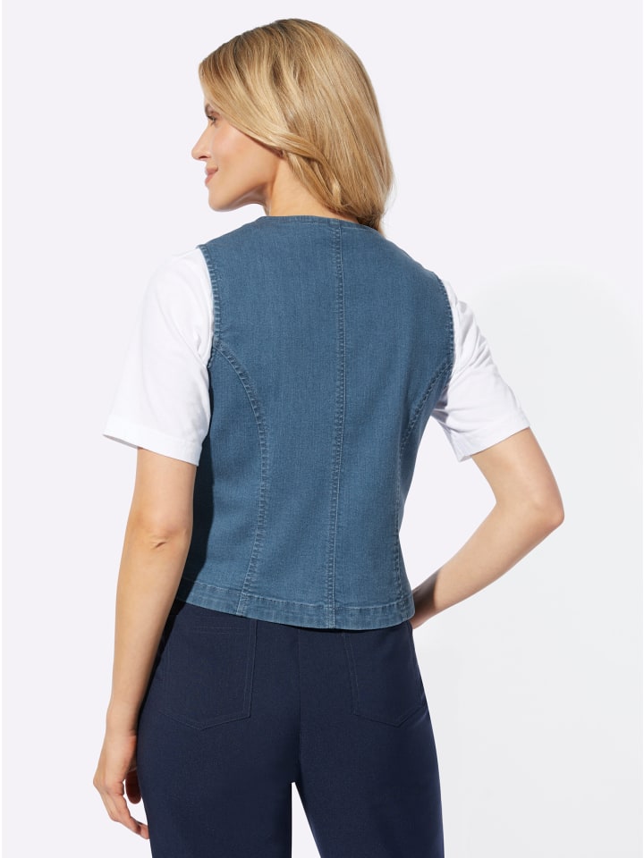Повседневный деним в женственном исполнении: джинсовый жилет с цветочной вышивкой спереди. Слегка приталенный, модный укороченный фасон с V-образным вырезом, планкой с металлическими пуговицами и зауженным нижним краем спереди. Формирующие швы обеспечивают идеальную посадку.