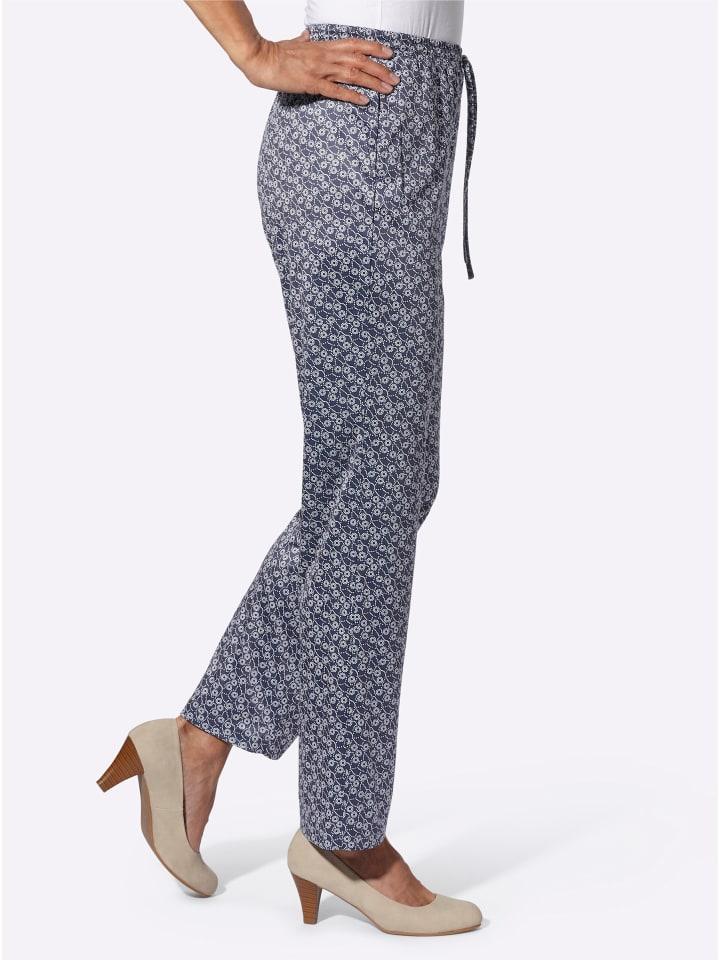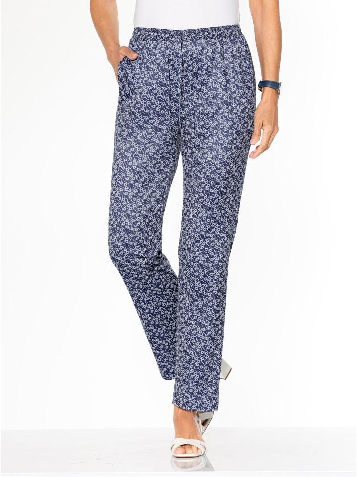 Постирать, высушить и носить - трикотажные брюки с цветочным принтом, не требующие особого ухода. С эластичным поясом по всему периметру, шнурком и завязкой. 2 кармана. Изготовлены из переработанного полиэстера. Ширина до щиколотки: около 42 см.
