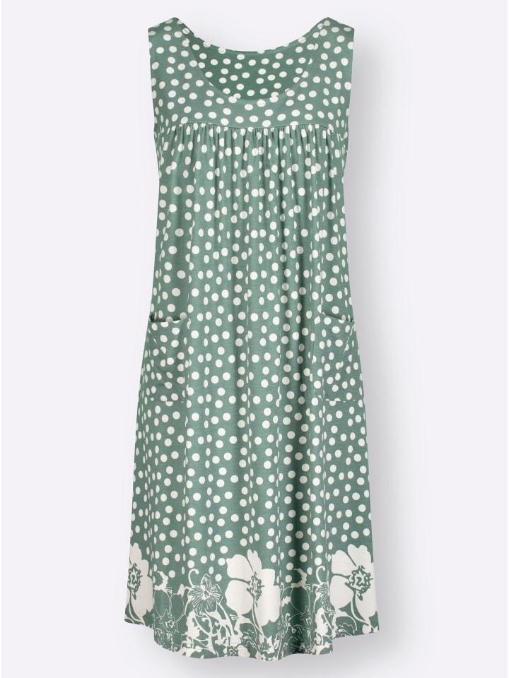 Платье из мягкого струящегося трикотажа с привлекательным принтом. Двухслойное, с фиксированным круглым вырезом и проймами. С двумя накладными карманами и привлекательными сборками.