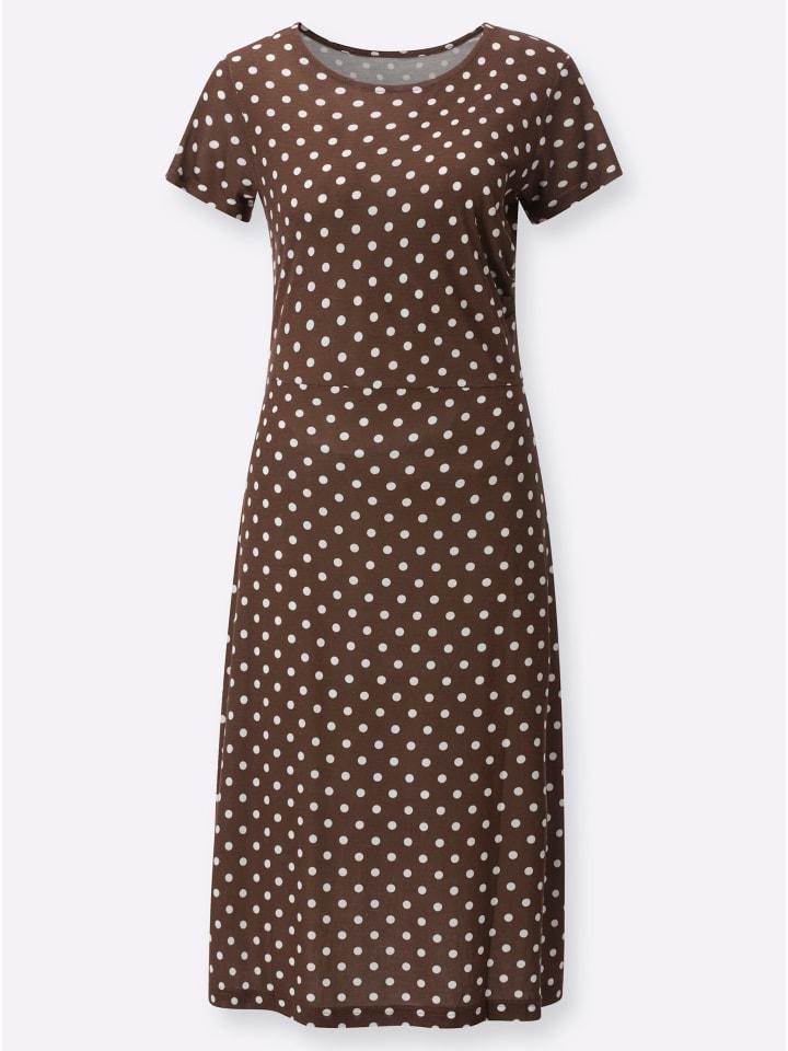 Это трикотажное платье с очаровательным узором в горошек - абсолютный must-have вашего гардероба! Мягкий А-образный силуэт создает женственный силуэт. Изящные складки на талии.