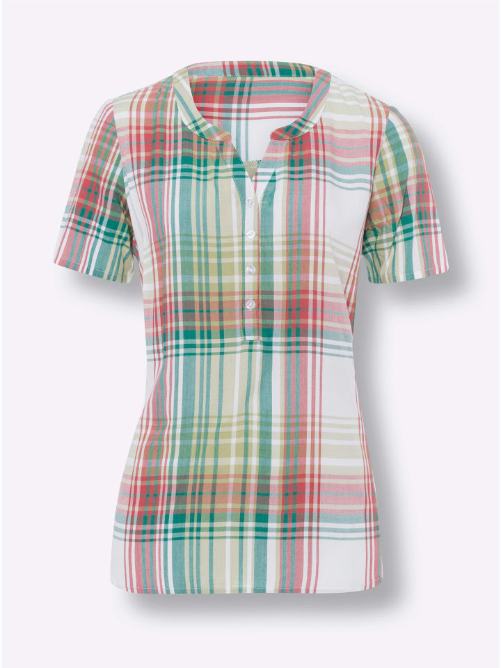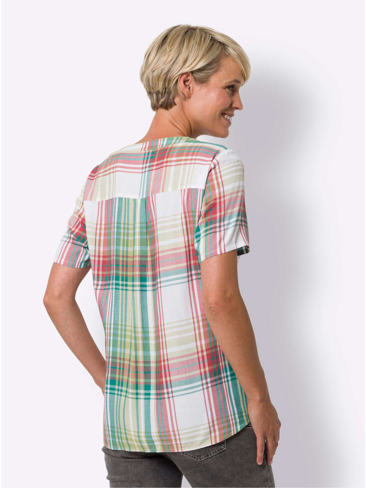 Клетчатая блузка из мягкой вискозы - идеальный вариант для тех, кто ценит комфорт и внешний вид. Круглый вырез горловины с небольшим V-образным вырезом, короткой планкой на пуговицах и вытачкой на груди. Она красиво сидит и подчеркивает фигуру благодаря кокетке со складкой сзади и слегка скругленному подолу.