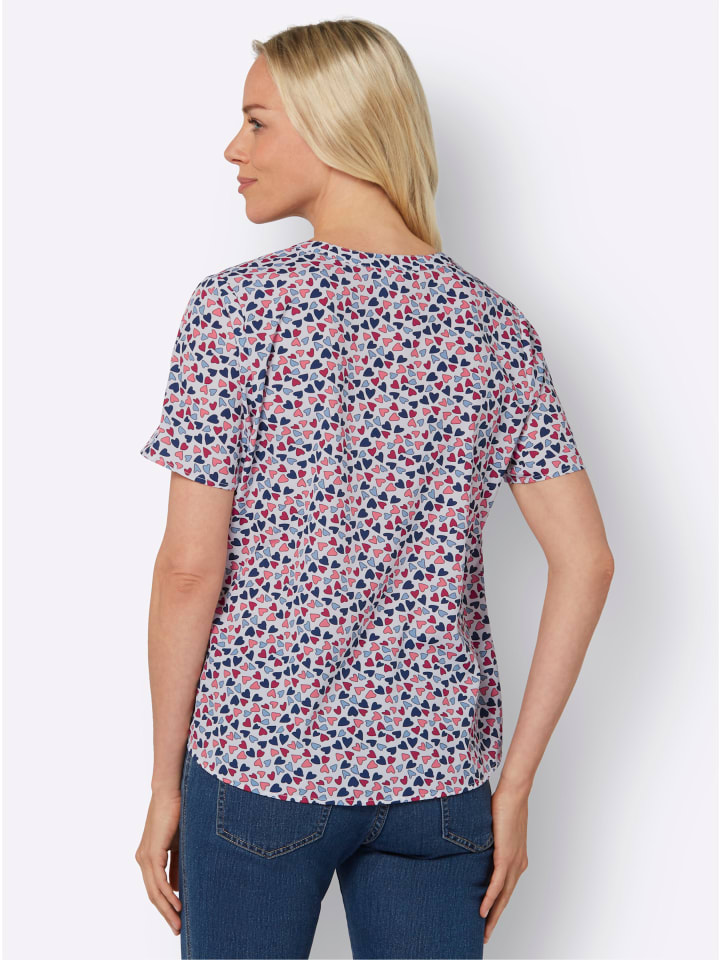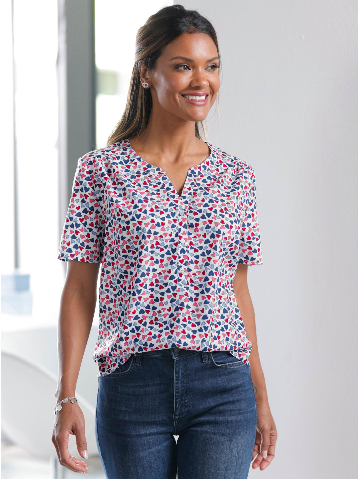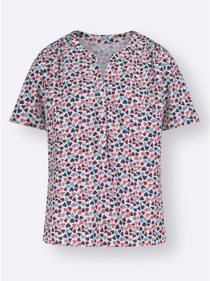 Эта блузка с короткими рукавами из воздушного крепа просто очаровательна. Круглый вырез с небольшим V-образным вырезом и короткой планкой на пуговицах. Кокетка на плечах украшена тонкими сборками. Слегка закругленный подол сзади немного длиннее, чем спереди, поэтому ее можно носить как навыпуск, так и наизнанку.
