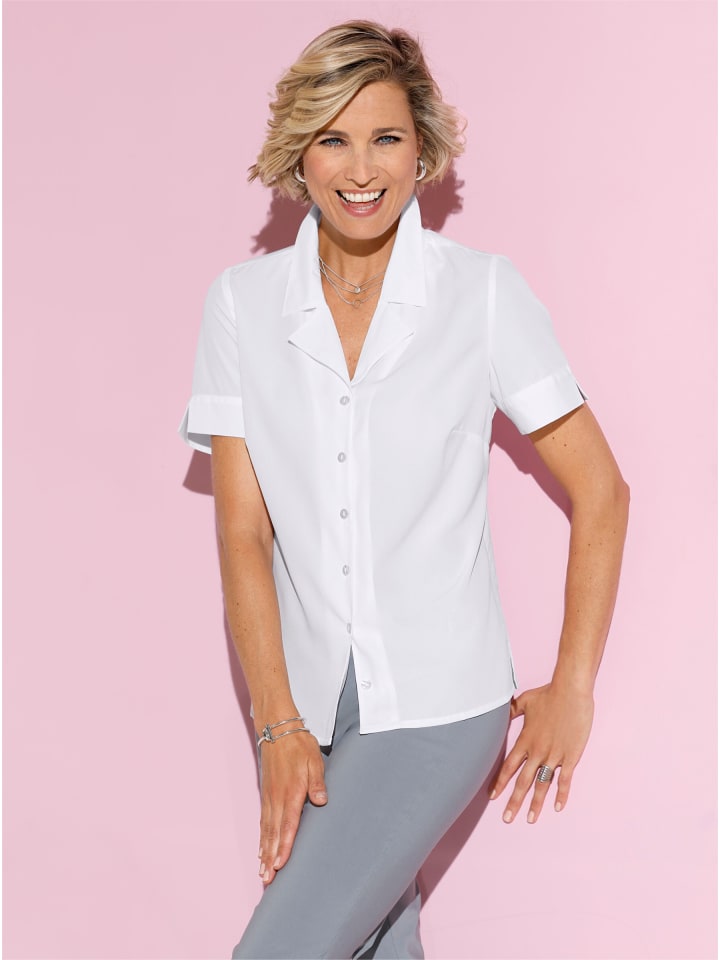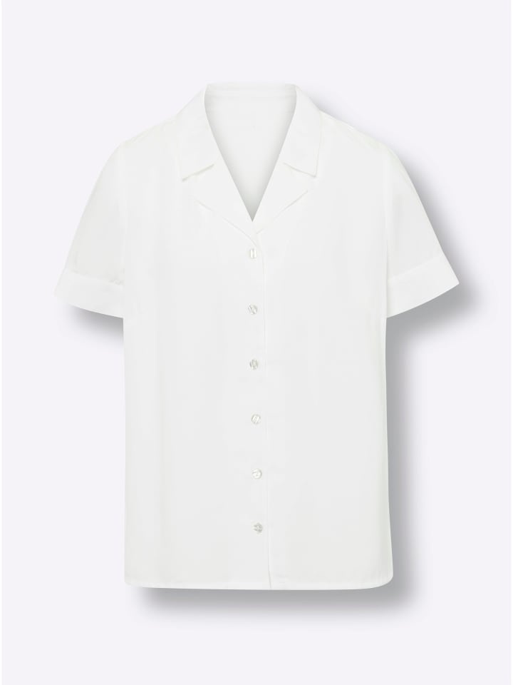 Классика для любого гардероба: блузка с короткими рукавами, аккуратным воротником с отложным воротником и застежкой на пуговицы по всей длине. Также: вытачки на груди, разрезы на манжетах и боковые разрезы по низу.
