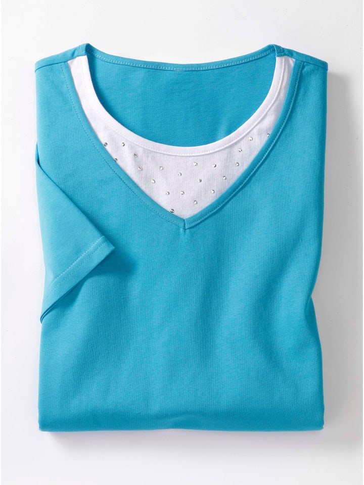 Рубашка выглядит великолепно благодаря белой вставке 2 в 1 на горловине, украшенной эффектно мерцающими серебристыми пластинками. Качество, приятное для кожи.