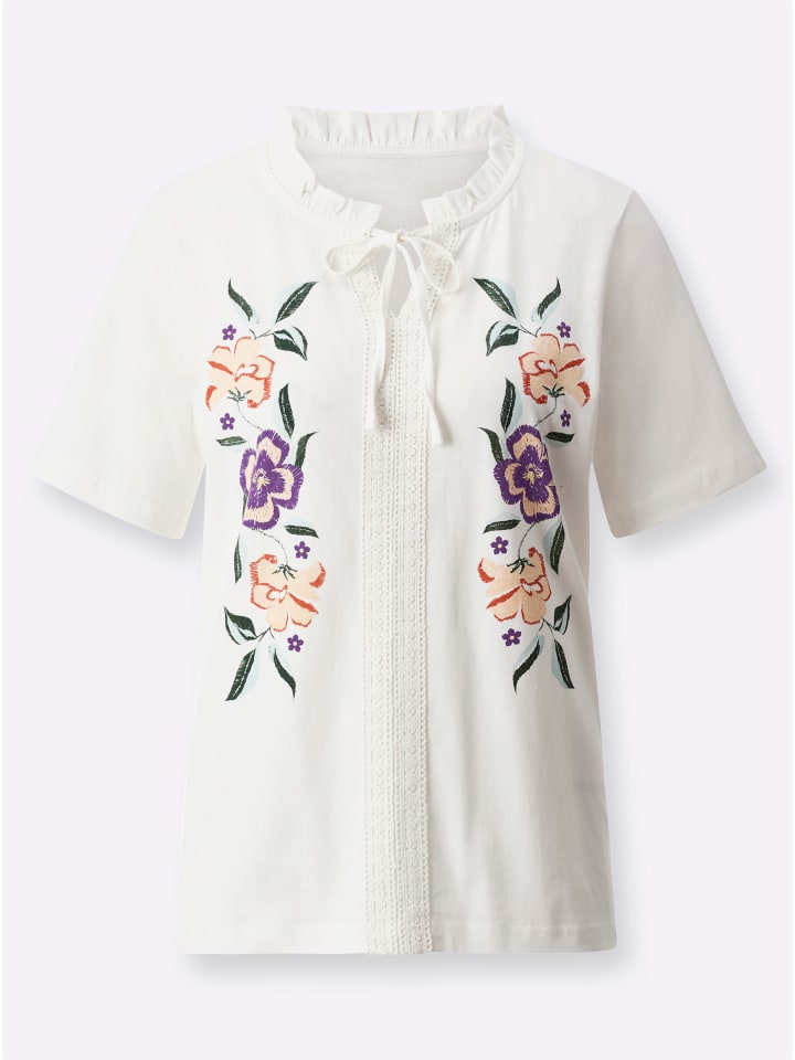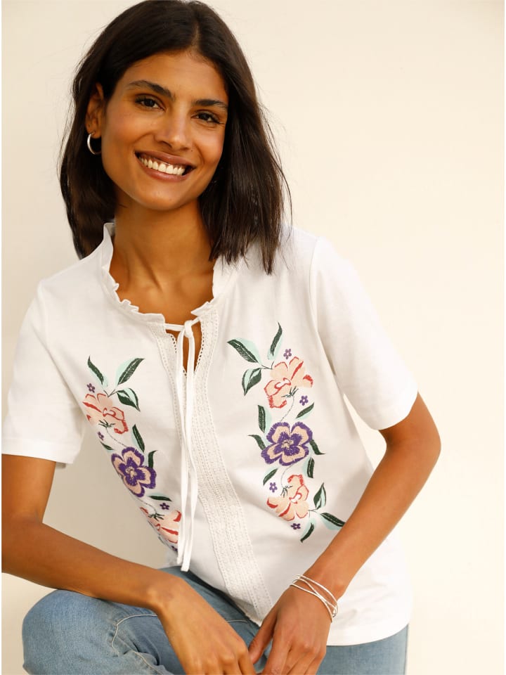Воздушная, ароматная, волшебная! Туника-рубашка с цветочным принтом спереди. Круглый вырез с V-образным вырезом и завязками украшен оборками. Кружевная отделка доходит до подола.