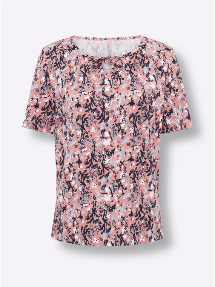 Эта рубашка с короткими рукавами очаровывает своим прекрасным цветочным узором! Очаровательные сборки на круглом вырезе с небольшим V-образным вырезом и завязкой. Изготовлена из приятной для кожи ткани.
