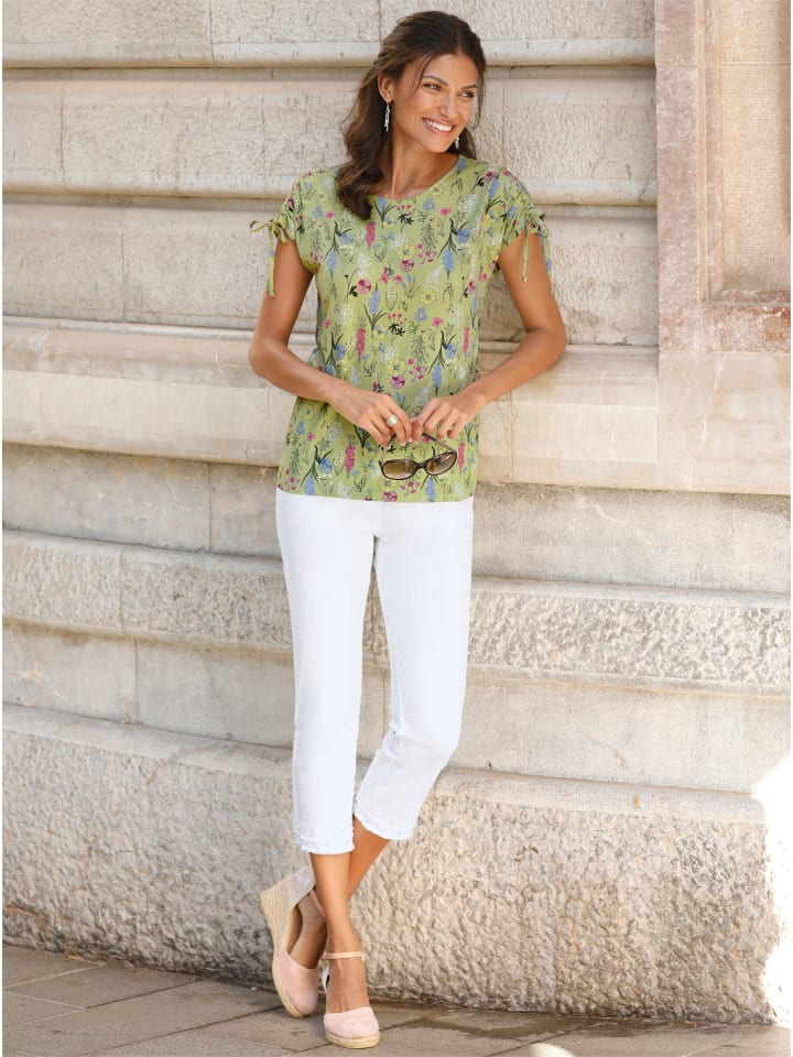 Очаровательная деталь этой рубашки с короткими рукавами и ярким цветочным принтом - кулиска с завязками, позволяющая индивидуально завязывать спущенные плечи. Круглый вырез.