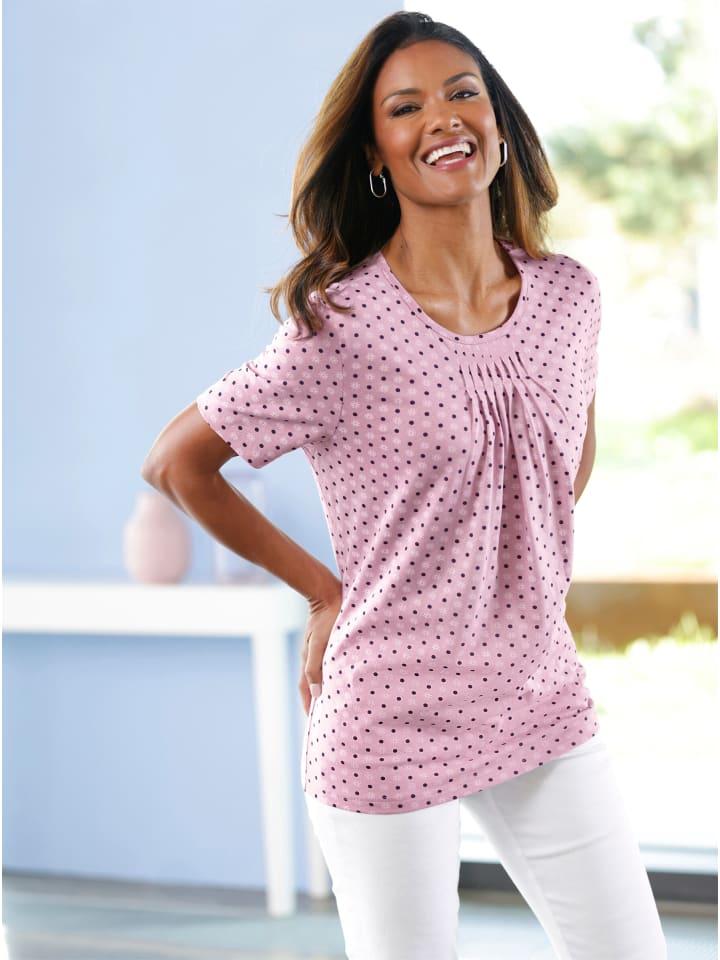 Мелкие узоры сейчас очень модные! Удобная рубашка в модном минималистичном дизайне. Декоративные складки на круглой горловине.