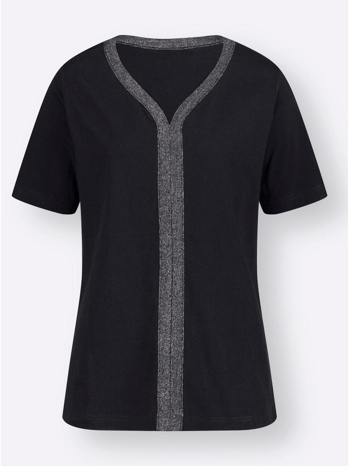 Модной приманкой для глаз этой рубашки с короткими рукавами является серебристая, сверкающая декоративная лента, которая проходит вдоль округлого V-образного выреза к передней части и далее к подолу.