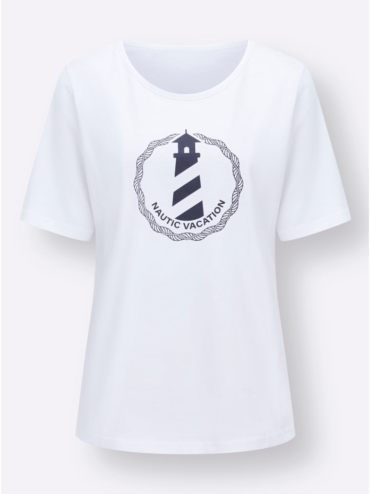 Эта рубашка с короткими рукавами навевает ощущение моря благодаря удачно расположенному морскому принту. Круглый вырез горловины украшен окантовкой. Приятная мягкая ткань.