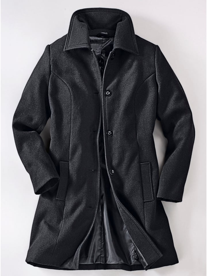 Пальто свободного кроя на теплой подкладке. Декоративные швы вдоль воротника и планки с пуговицами. Подплечники для идеальной посадки. 2 кармана с клапанами, рельефные швы.