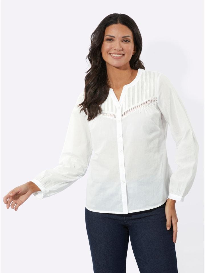 Романтичная блузка с длинными рукавами, декорированная кантом, кружевом и сборками! V-образный крой визуально удлиняет верхнюю часть тела. Присборенная кокетка сзади обеспечивает свободный крой и большую свободу движений. Спереди - застежка на пуговицы по всей длине, а на длинных рукавах - узкие манжеты. Все пуговицы подобраны по цвету.