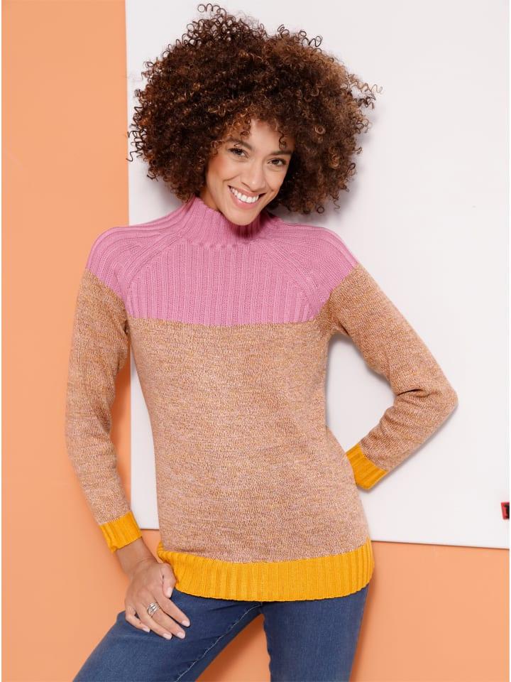 Спортивный свитер с длинными рукавами, с ребристым верхом и пестрым нижним краем. Привлекательный воротник-бокал. Длинные рукава реглан и нижний край отделаны резинкой.