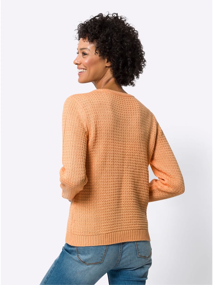 Свитер с длинными рукавами, связанный красивым фактурным узором по всей длине. С V-образным вырезом и ребристыми манжетами и нижним краем. Качество, не требующее особого ухода.
