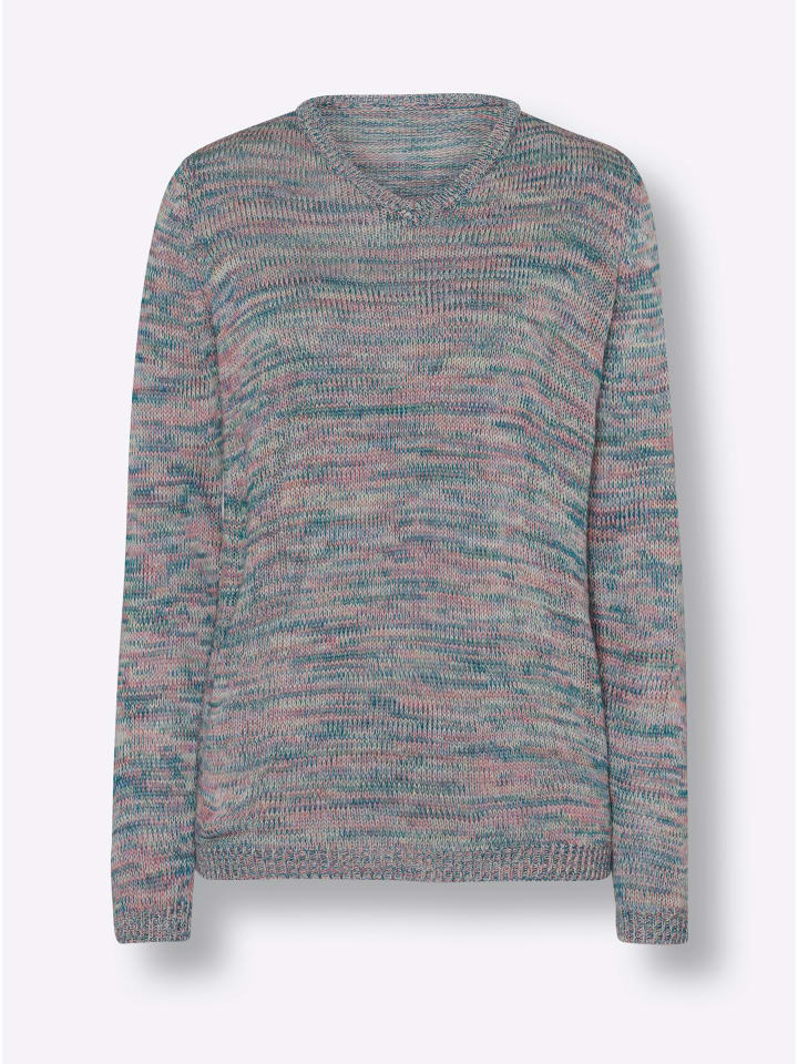 Удивительно мягкий и простой в уходе свитер в гармоничном меланжевом стиле. Ребристая отделка манжет на V-образном вырезе, длинных рукавах и подоле. Тщательно выполненная вязка.