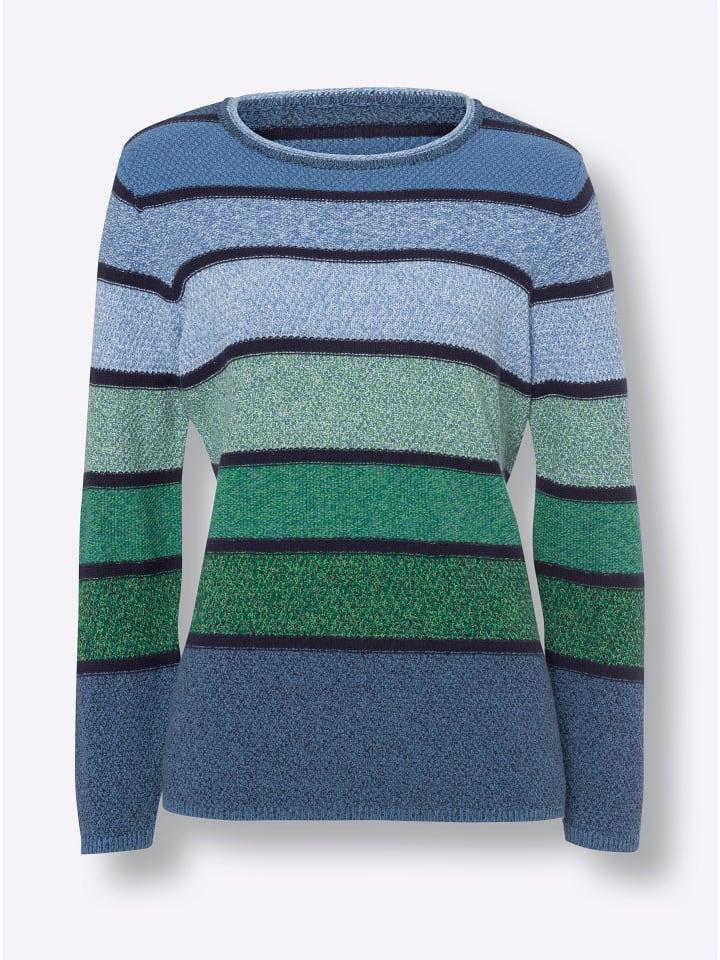 Отличная цена, отличное качество, свежая цветовая гамма - мы в восторге от этого свитера с длинными рукавами! С пестрыми полосками и разнообразными узорами. Ребристые манжеты на резинке и ребристый край.