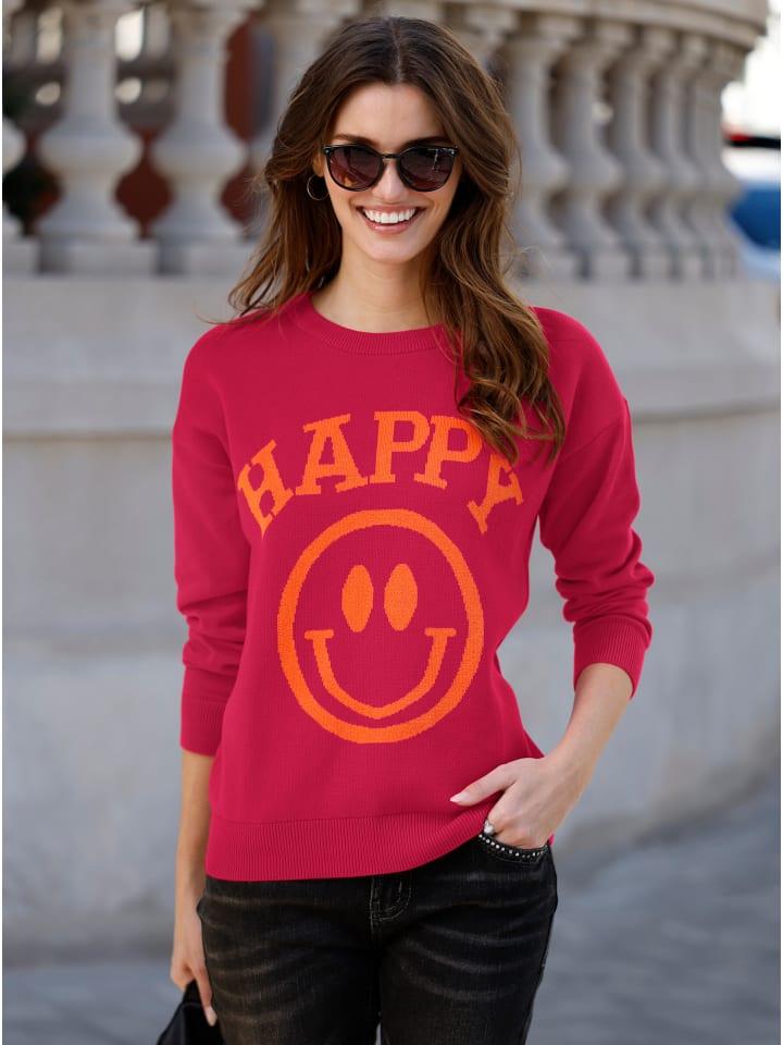 Пожалуйста, улыбнитесь! Длинный свитер с милым принтом и надписью Happy. Интарсия спереди. Ребристые манжеты на круглой горловине, рукавах и подоле.